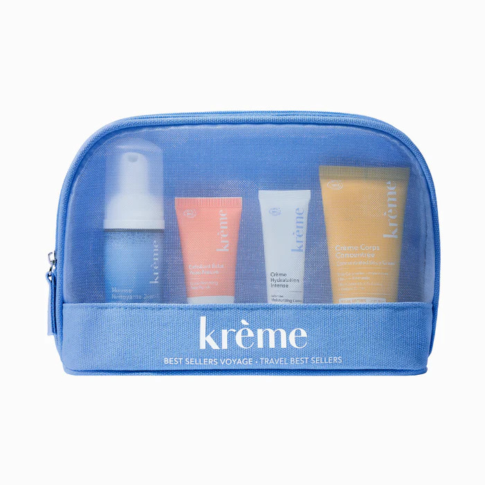 Le Kit Best-Seller Voyage réunit 4 soins dans leur format voyage, à l'intérieur d'une jolie trousse en coton bleue réutilisable. C'est le kit parfait pour voyager léger ou (faire) découvrir Krème.